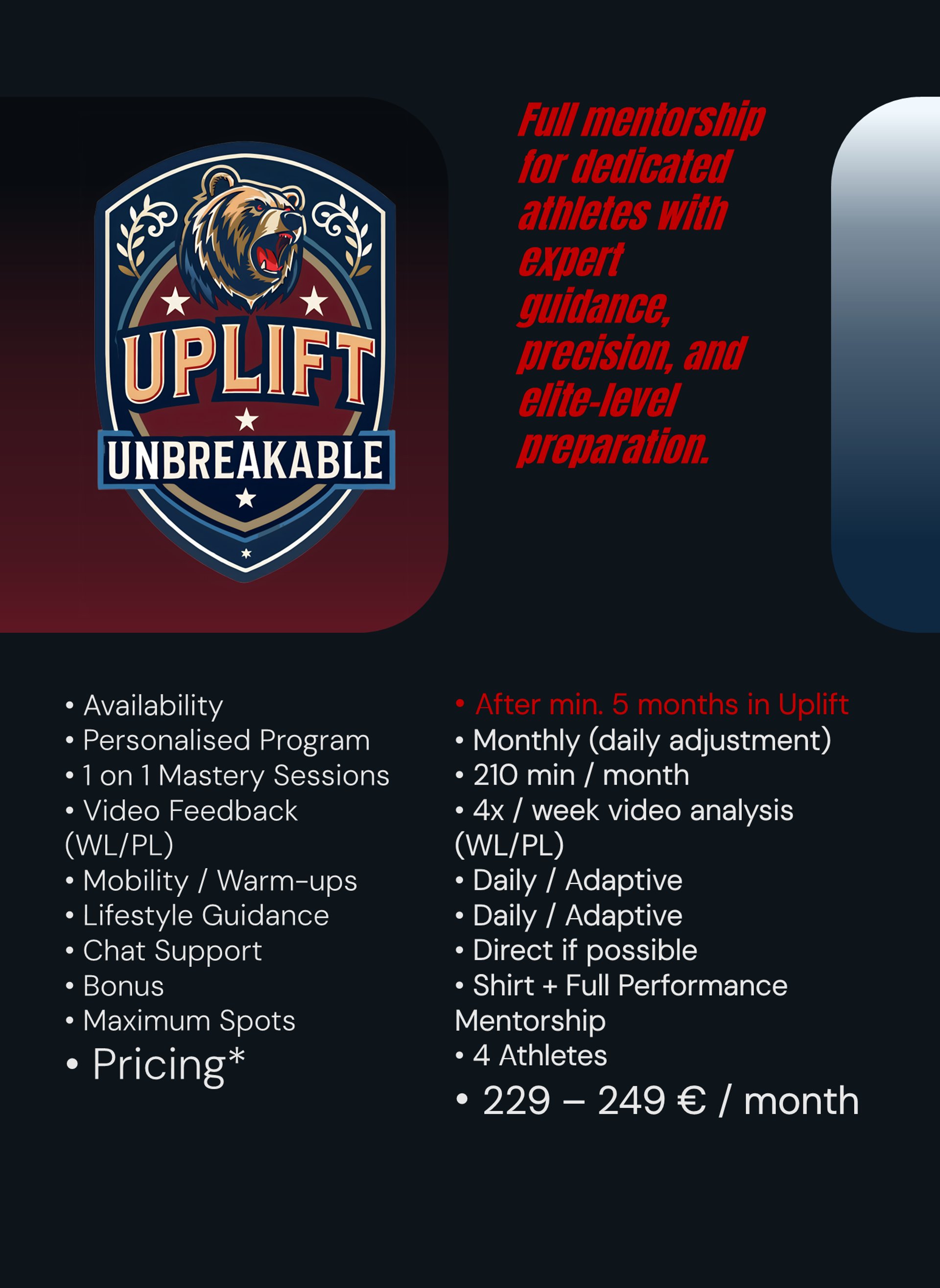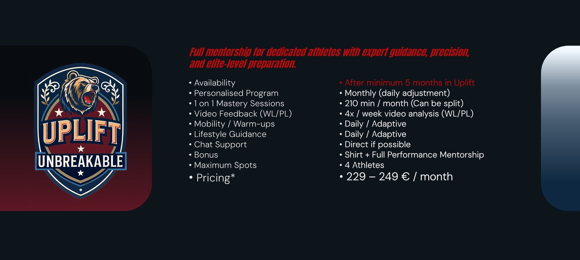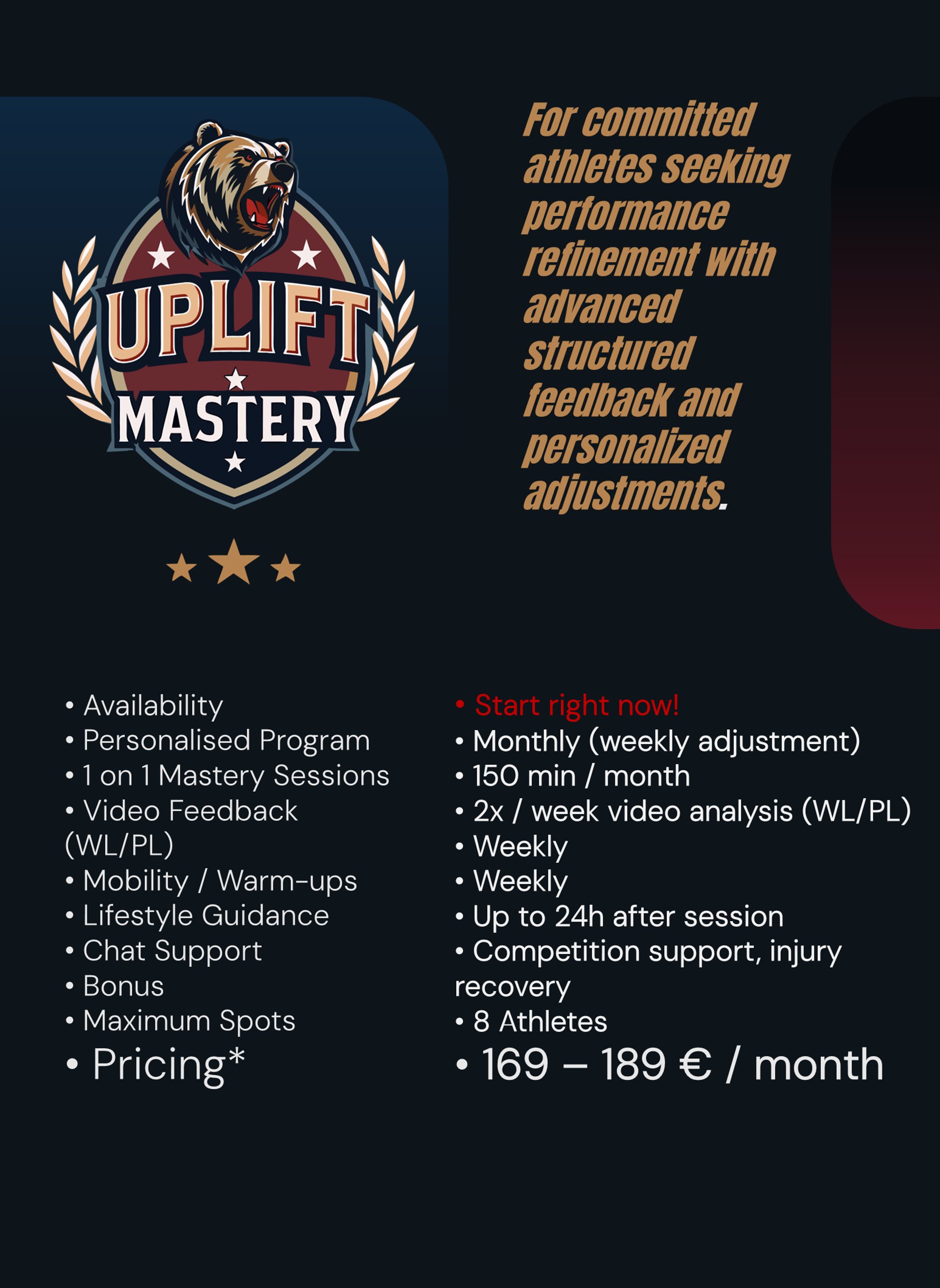 Full Performance Mentorship* - Personal guidance to help you reach your peak — technically, physically, and mentally. Your training, recovery, and progress are closely monitored, with adjustments and feedback to ensure you achieve your best safely and effectively.