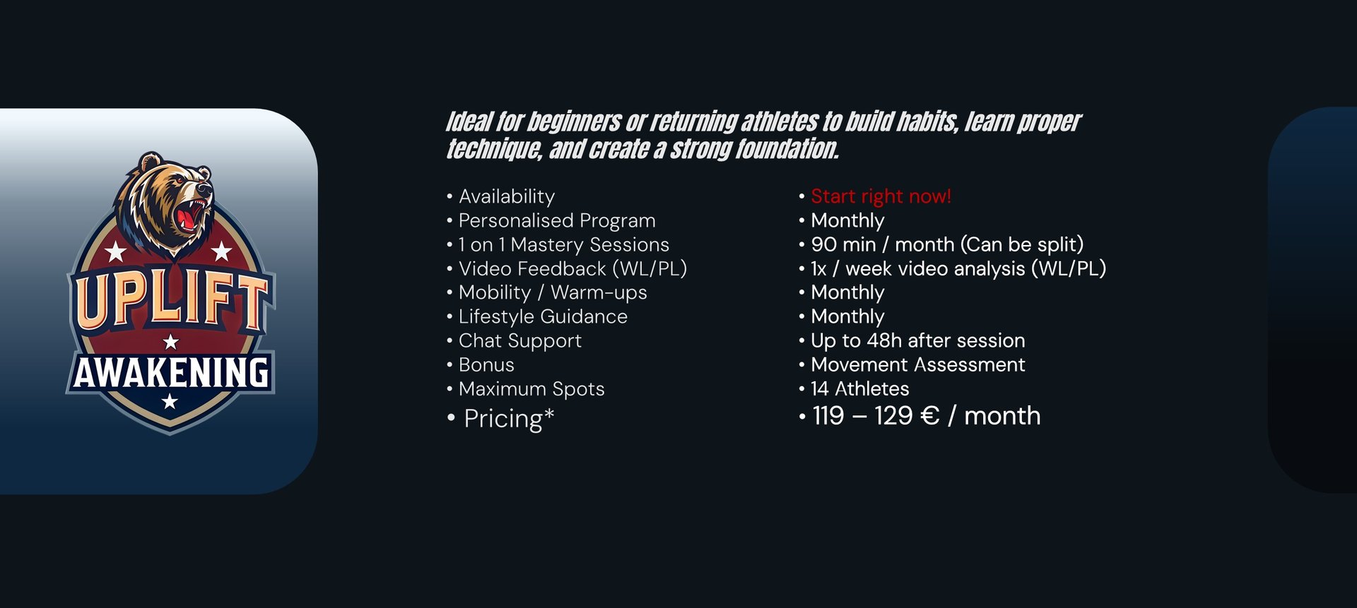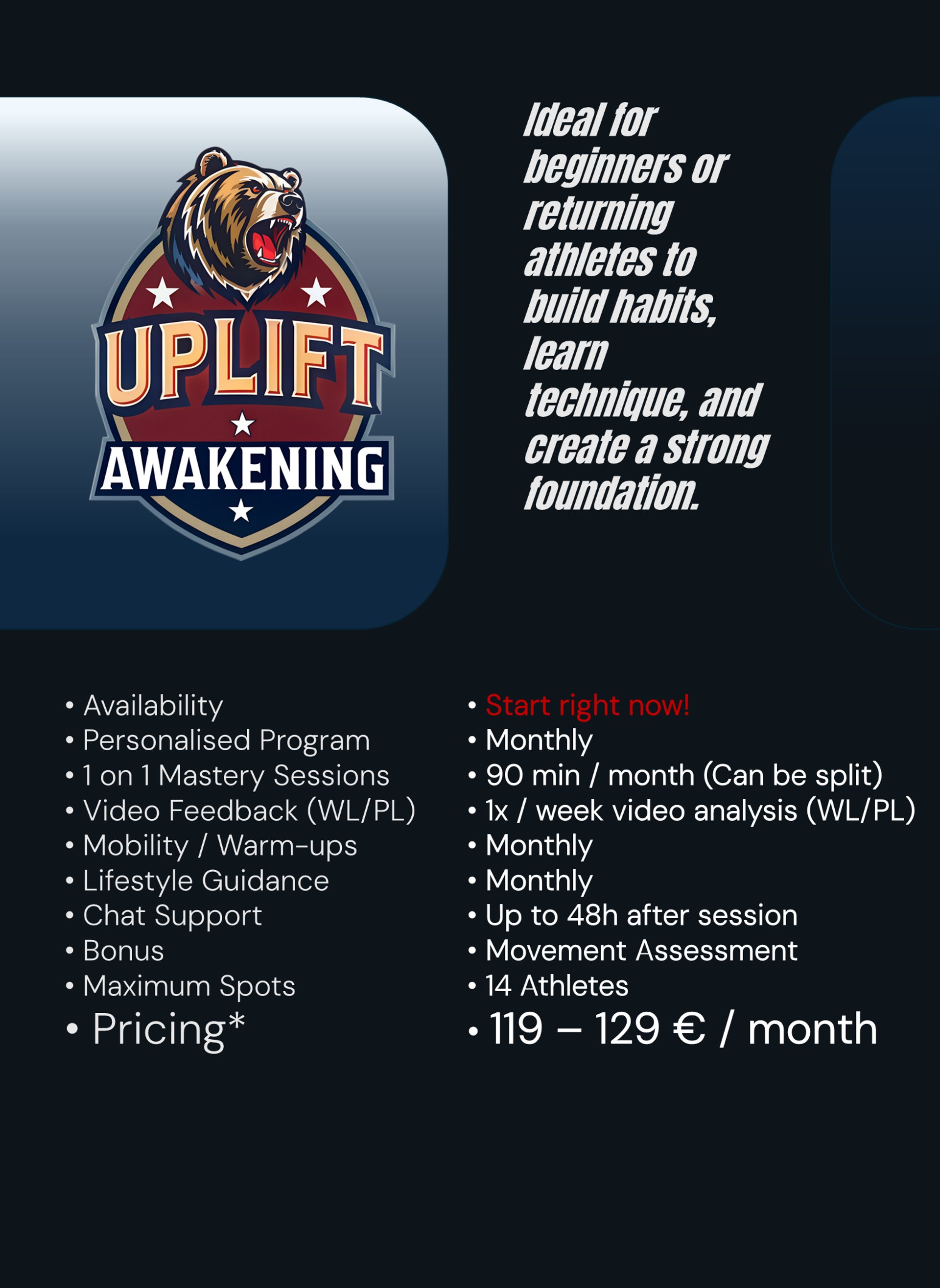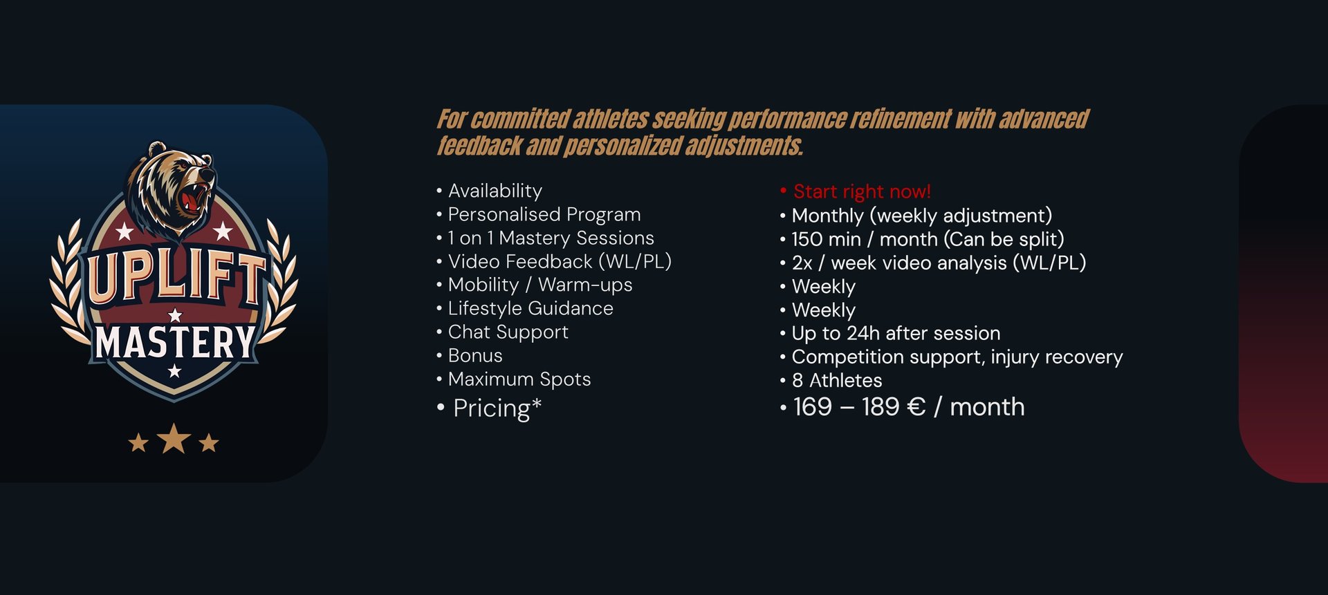 Full Performance Mentorship* - Personal guidance to help you reach your peak — technically, physically, and mentally. Your training, recovery, and progress are closely monitored, with adjustments and feedback to ensure you achieve your best safely and effectively.